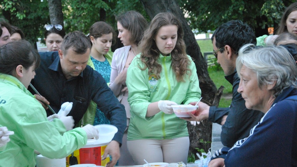22 июня юноши и девушки Никольского Патриаршего Подворья и храма Рождества Христова во Фрязино вместе с ребятами из движения «Патриаршие добровольцы» покормили бездомных на Киевском вокзале. Было организовано горячее питание: суп, каша с мясом и чай. Так же каждый нуждающийся получил с собой продуктовый набор. Во время раздачи еды ребята читали и пели акафист Божией Матери, а после того, как все были накормлены, священнослужитель с Никольского Подворья совершил заупокойную литую по погибшим в годы Великой Отечественной Войны. Помолившись, молодые люди пообщались, попили лимонаду и поели черешни. Акции по кормлению бездомных на Киевском вокзале становятся не только общим добрым делом Православной молодежи, но и местом дружеского общения юношей и девушек с разных приходов Москвы и Московской области.