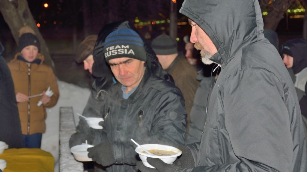25 января, юноши и девушки с Патриаршего Подворья приготовив в полевой кухне горячий обед, выехали на Киевский вокзал, что бы покормить вместе с Православными добровольцами бездомных. Горячие гороховый суп, солдатская каша и сладкий чай в двадцатиградусный мороз были как никогда кстати.