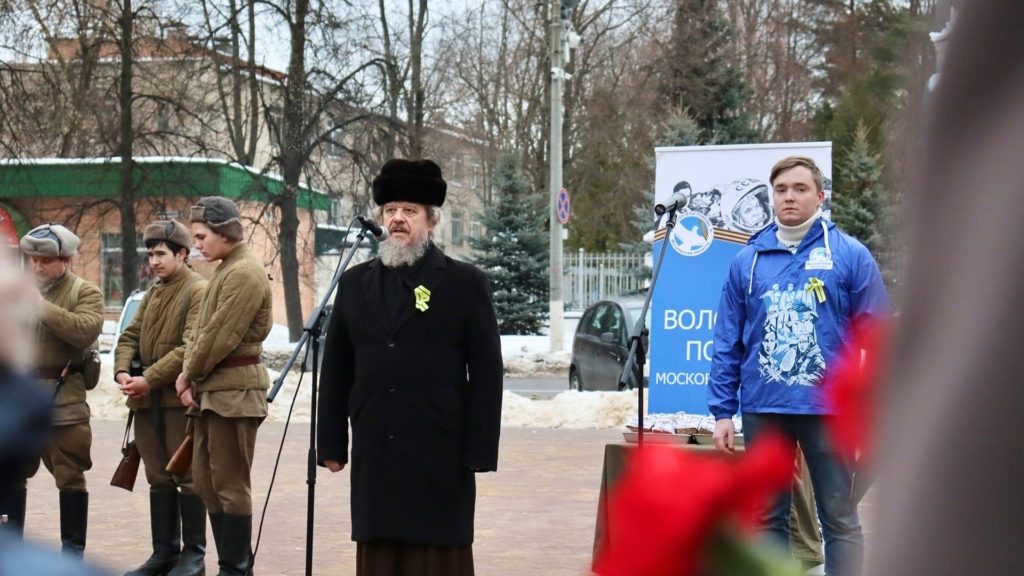 С приветственным словом к собравшимся горожанам обратился настоятель храма Рождества Христова протоиерей Сергий Киселев. Он подчеркнул, что напоминание юному поколению о великом прошлом Родины важный фактор, необходимый, чтобы оно знало, кому обязано всем, чтобы любило свое Отечество и умело побеждать благородством, мужеством и верой в Бога. Незримый многочисленный сонм святых предстоял в те страшные военные дни пред Престолом Божиим в молитве за нашу Родину! Отец Сергий рассказал случай, когда старцу митрополиту Зиновию (Мажуга) в дни Великой Отечественной войны во время молитвы было видение, как Святая Равноапостольная Нина на коленях усердно молится о помощи страждущим людям Ленинграда и из ее глаз по щекам спадают слезы в виде хрустальных виноградин. Блокада была снята в день памяти Равноапостольной Нины! Издревле на Руси считалось: в день какого святого одержана победа, тот святой и способствовал ей. После этого в знак благодарности об избавлении в каждом храме Ленинграда присутствовала икона Равноапостольной Нины с соответствующей надписью.